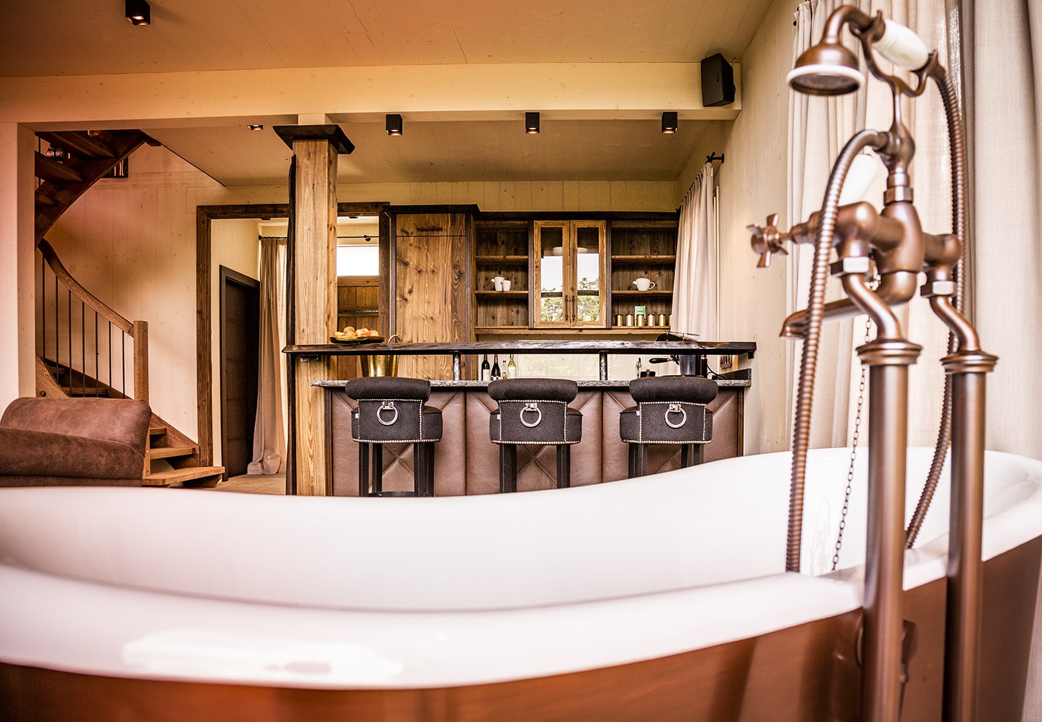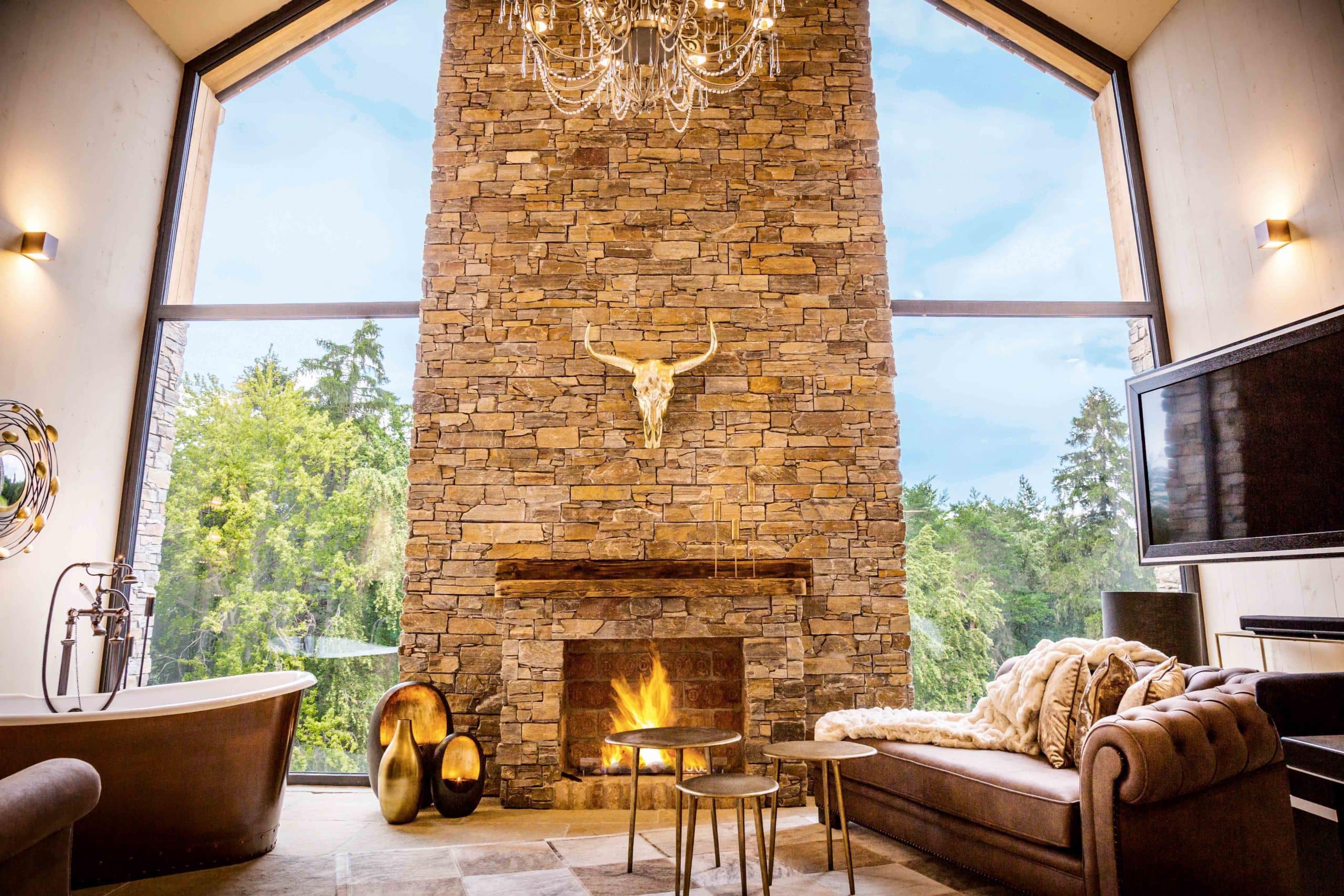 - freistehende Kupfer-Badewanne vor dem steinernen Kamin