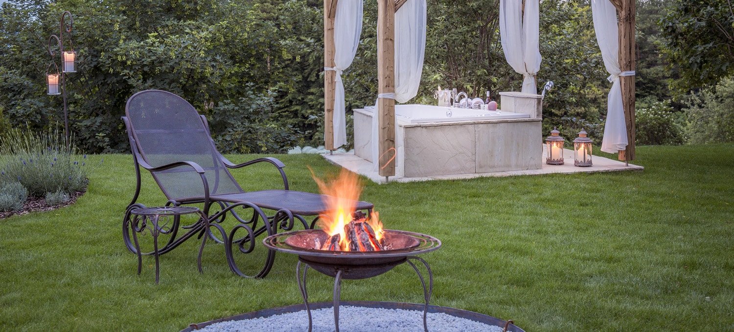 - Private Spa zur alleinigen Nutzung: 400 m² großer, romantischer Spa-Garten mit Sauna-Kubus und Badewanne im Freien, errichtet auf speziellen Energieplätzen. Ruheraum im Chalet.