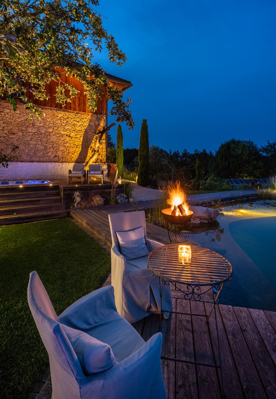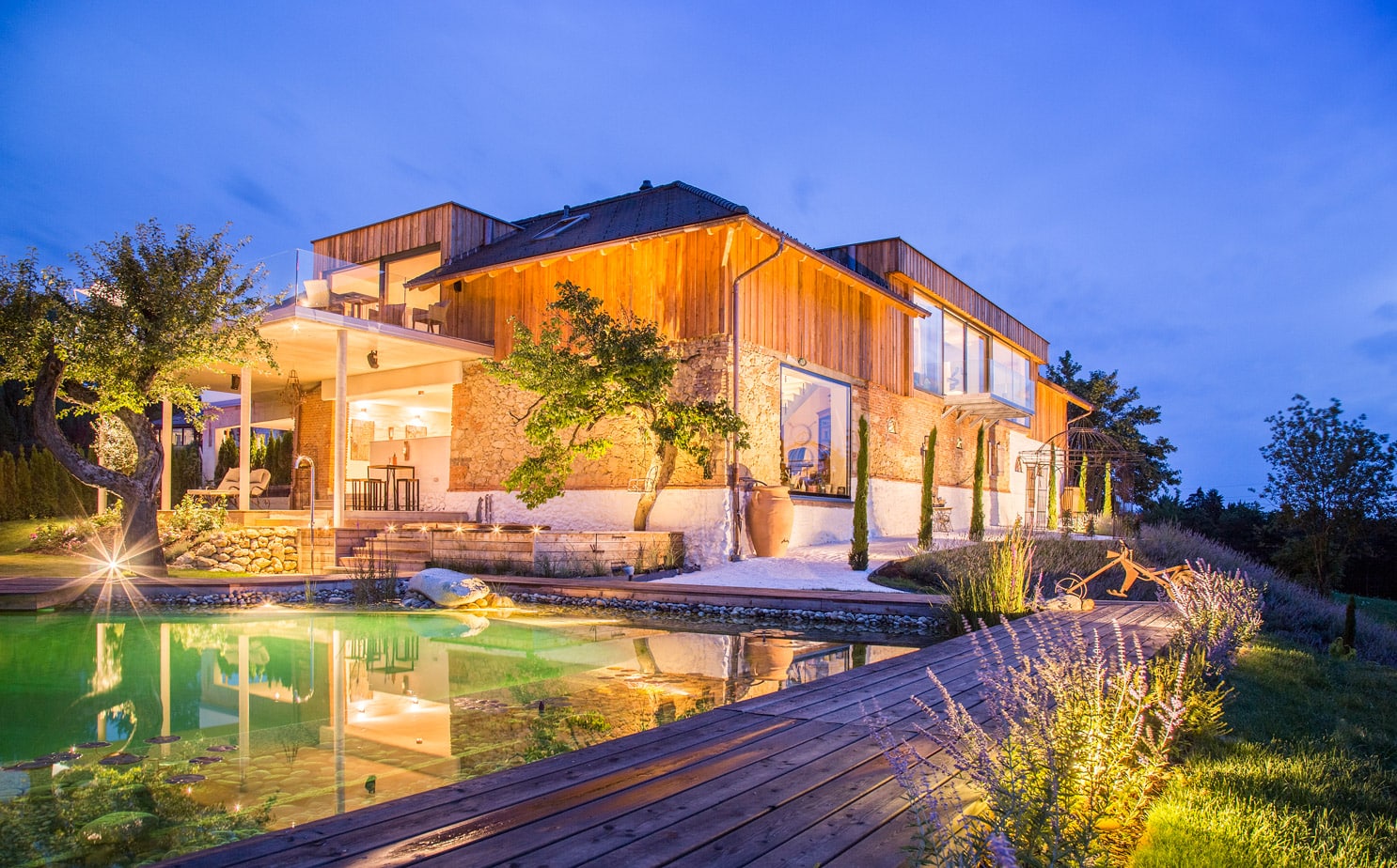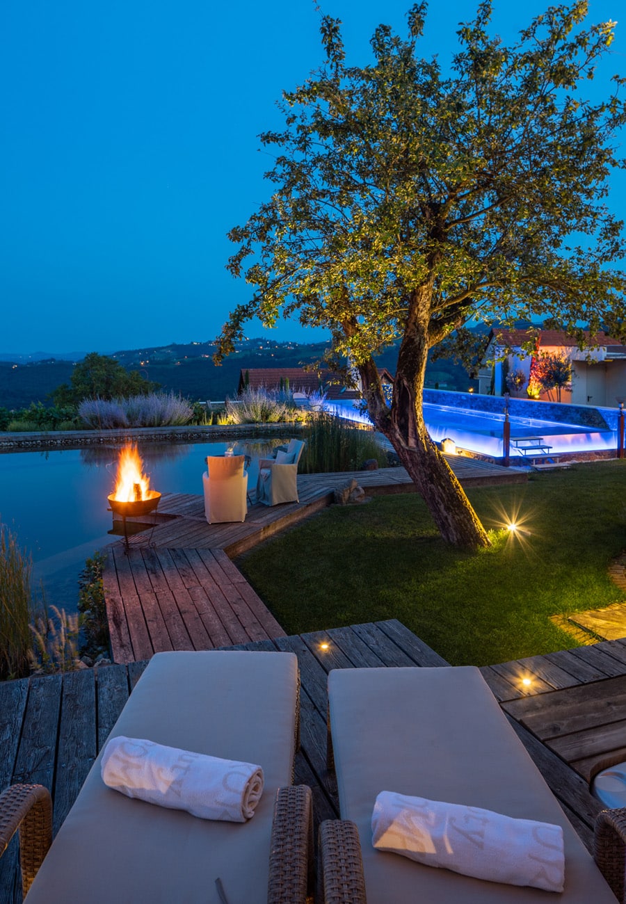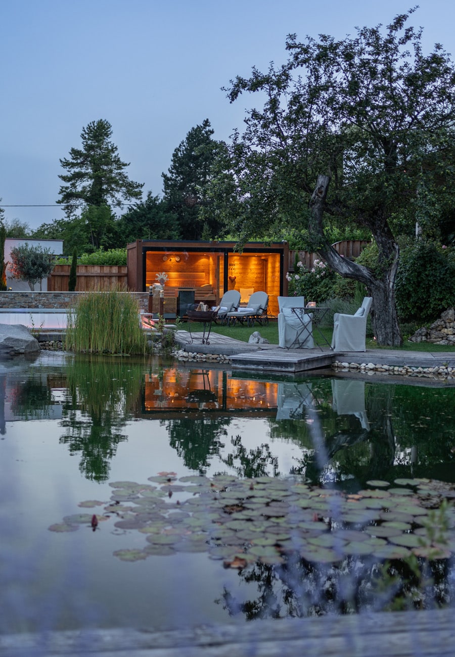 - Wellness & Fitness: 600 m² idyllic natural swimming pond and 15.000 m² park facilities with sauna-cube, „snack-garden“, cosy places for relaxing, Champagne-Lounge, open fires.