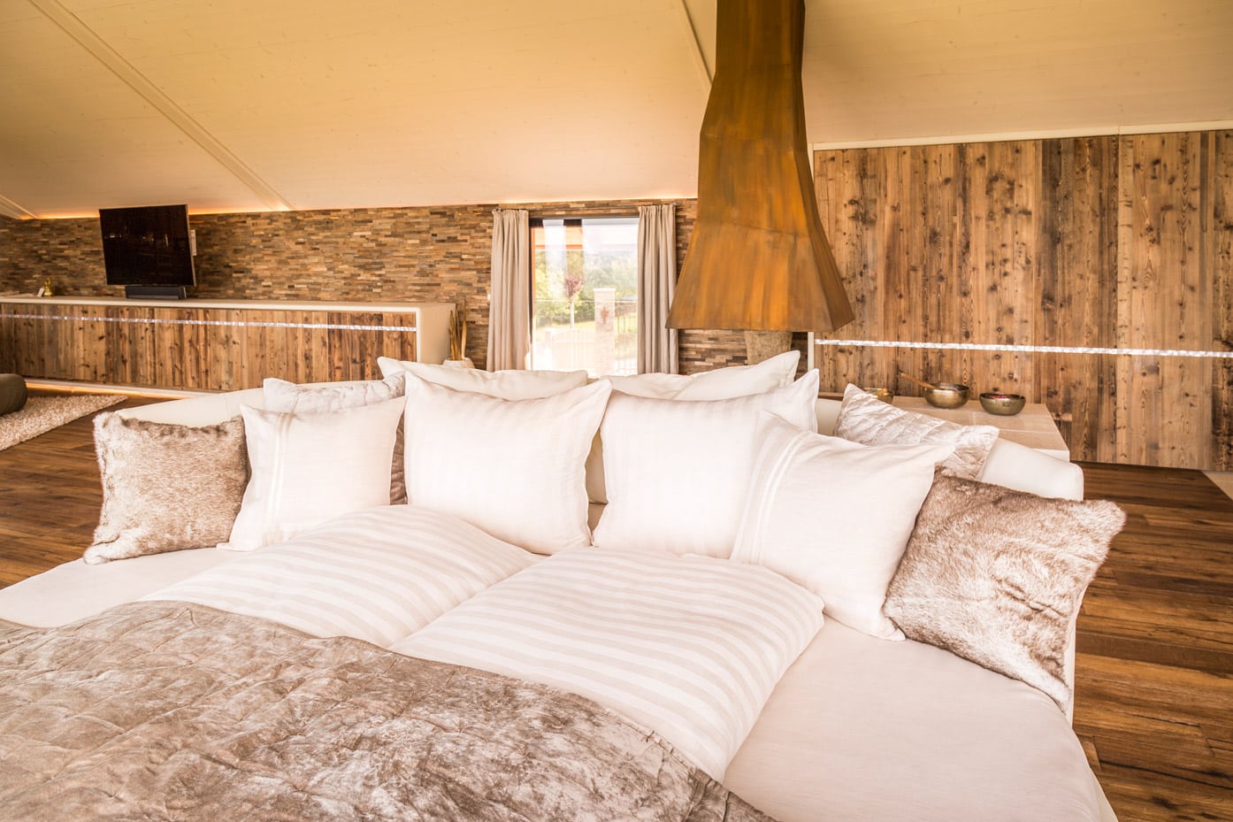 * Private Spa: Alle Chalets und Loft inkl. Private Spa (Sauna, Badewanne, Outdoor-Dusche). Chalet Steppenfuchs mit Ganzjahres-Infinitypool und Whirlpool. Loft mit Infinity Pool, eigenem Schwimmteich, Whirlpool und 4.000 m² Park.