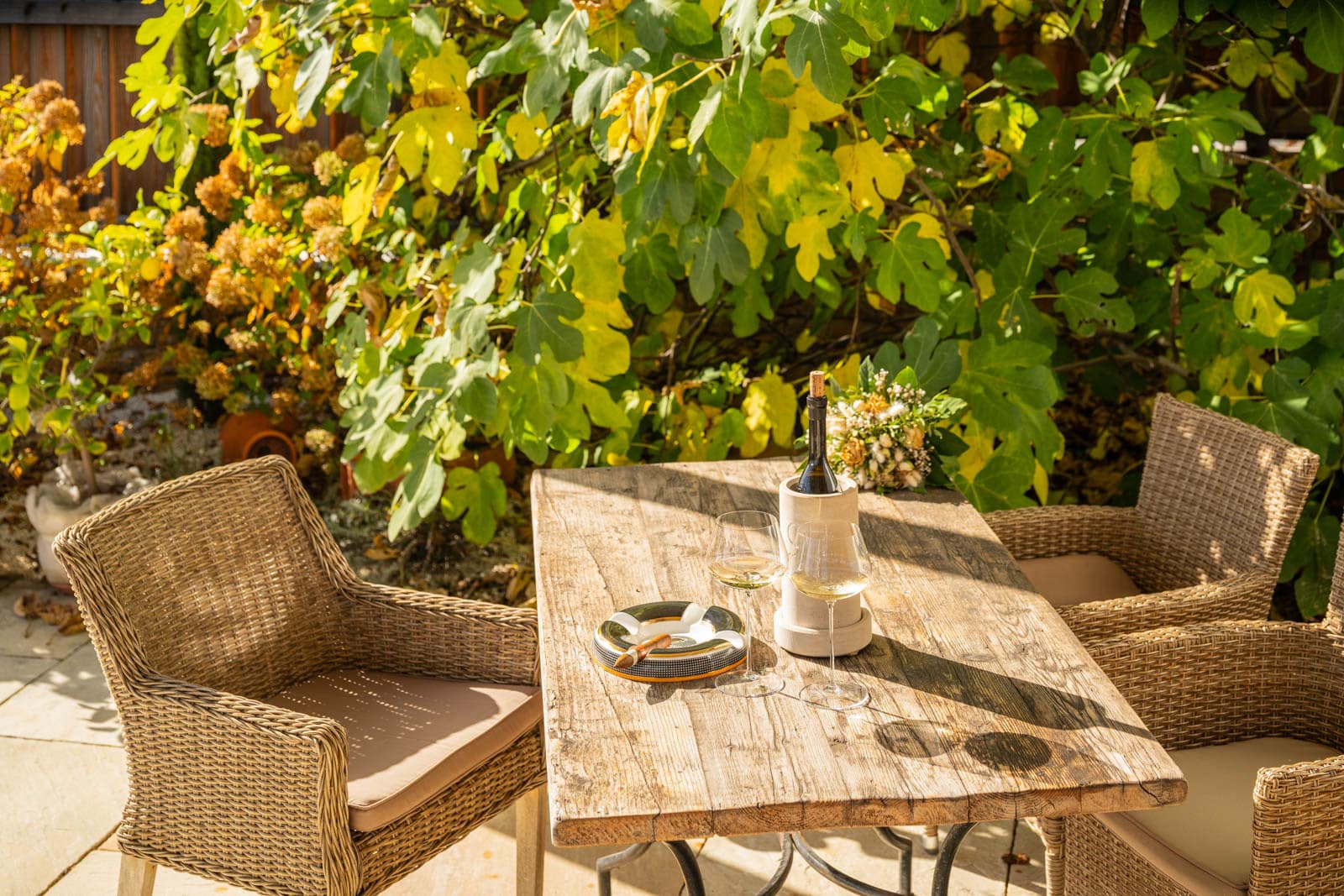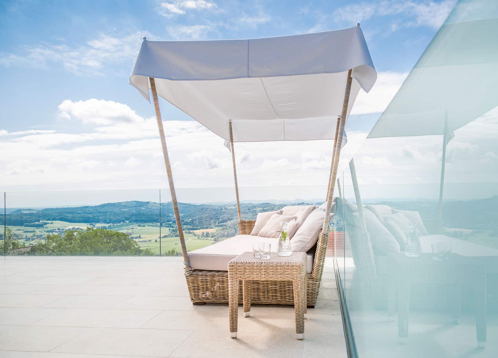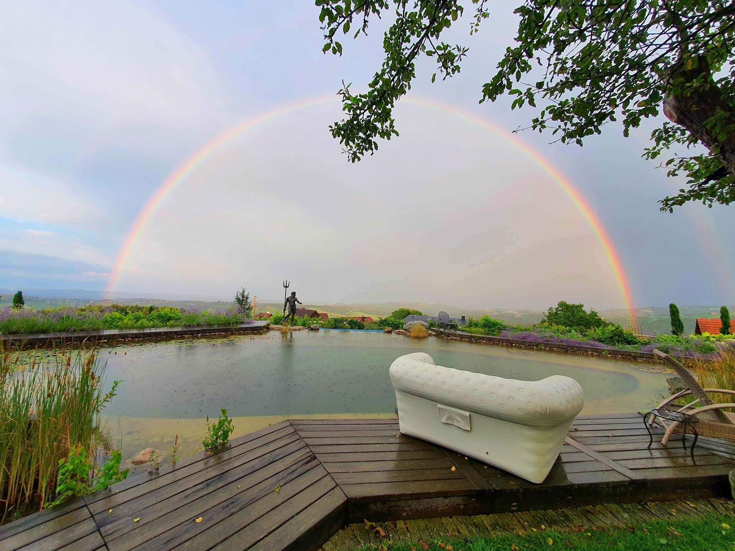 - Alleinige Benützung des Private Spa: Saunahaus im Freien, 200 m² Infinity-Naturschwimmteich und 12 x 3 m Infinity-Pool, Outdoor-Whirlpool, Außendusche, 4.000 m² Park mit Rosenpavillon am Lavendelhügel, Weinterrassen und Kraftplätzen, Kaffee-, Tee-, Vitalbar
