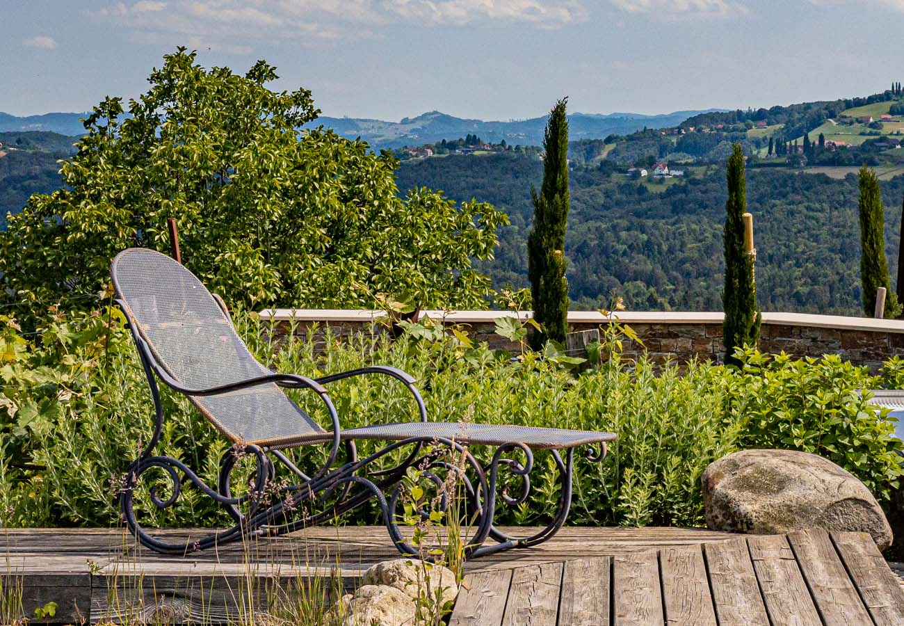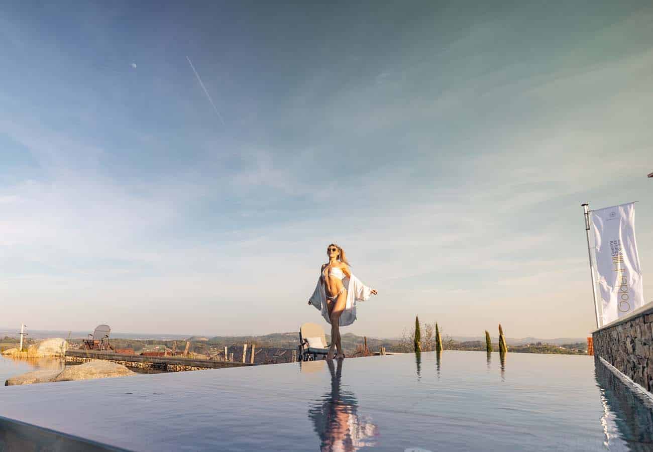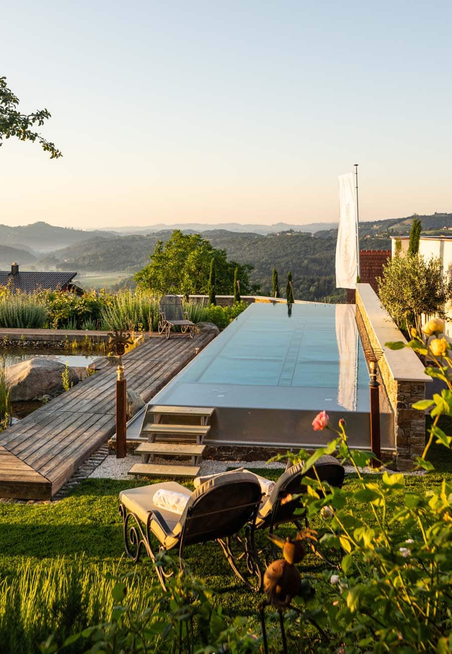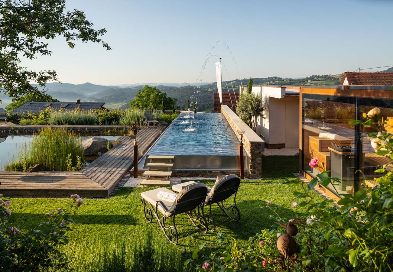 - Private Spa mit 200 m² großem Infinity-Naturschwimmteich und 12 x 3 m Infinity-Pool, eingebettet im terassierten Weinberg, großzügigem Sauna-Kubus und Whirlpool im Freien