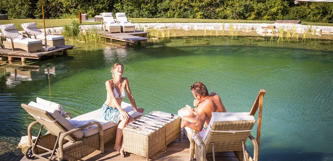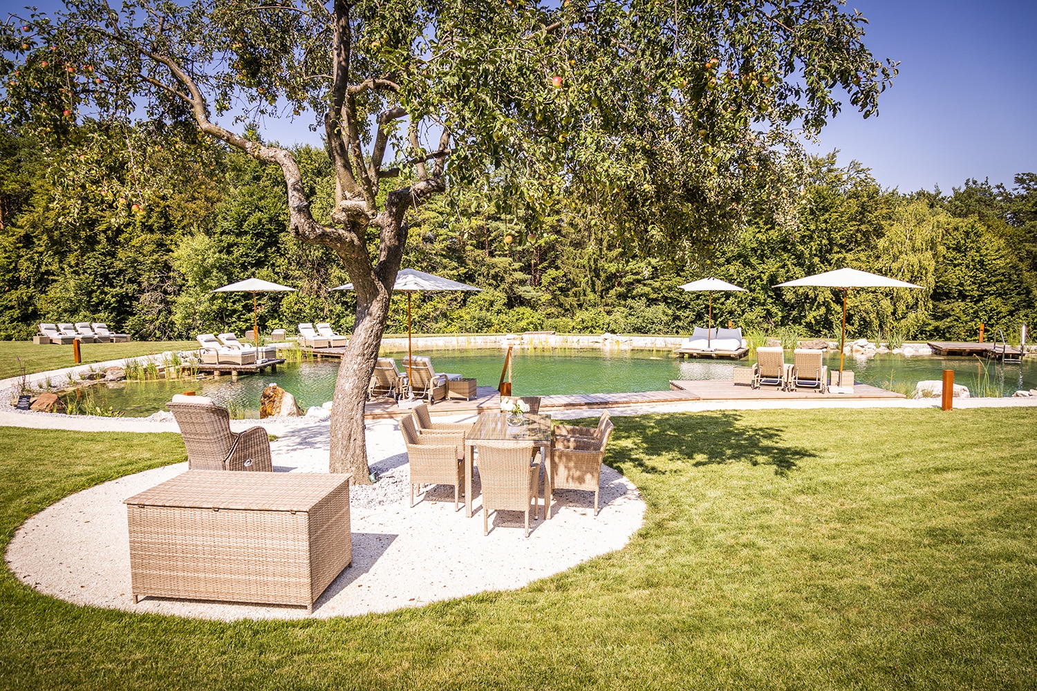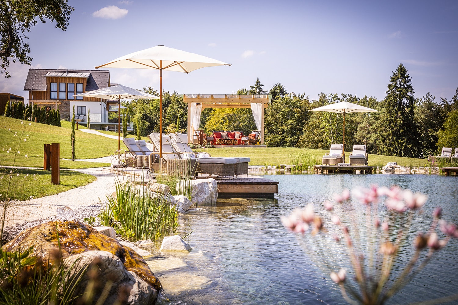 Unser 600 m² großer, preisgekrönter Naturschwimmteich mit idyllischen Wohlfühloasen ist das Herzstück von Golden Hill. Schwimmen Sie sich frei und genießen Sie absolute Privatsphäre mit völliger Berührungsfreiheit. Ihr Logenplatz am Wasser ist für Sie reserviert! So geht Sommerurlaub in der Südsteiermark!