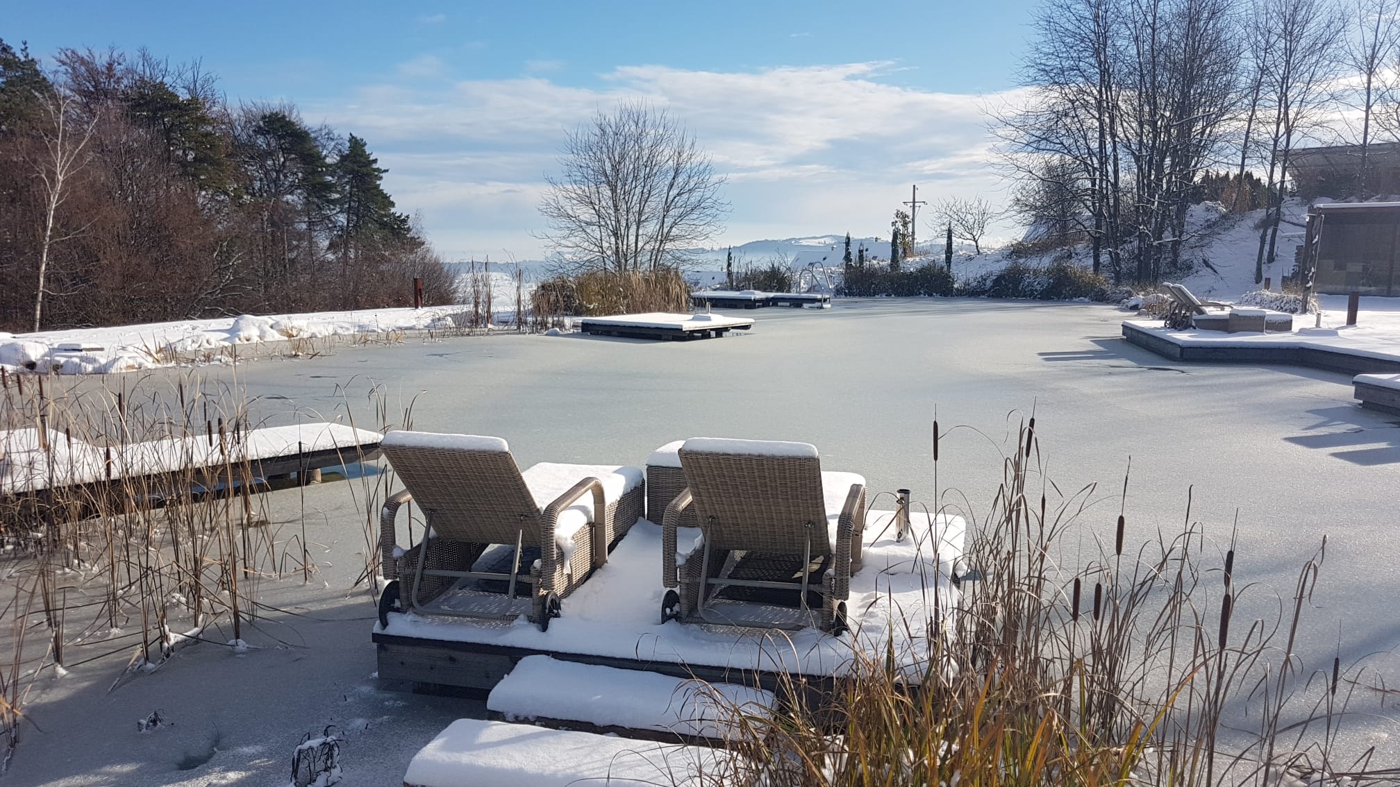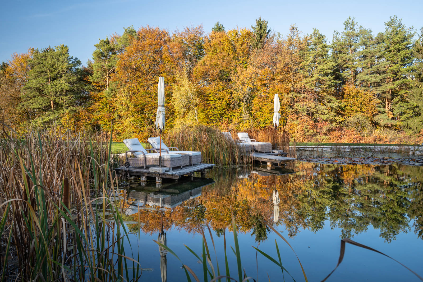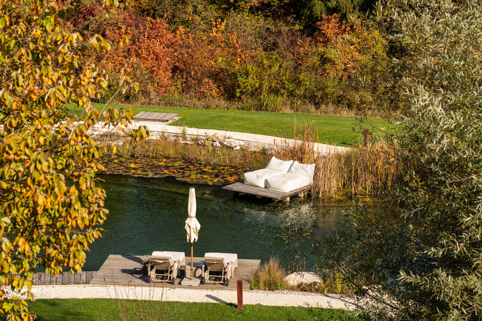 Genießen Sie in Ihrem Chalet-Urlaub neben Ihrem Private Spa im eigenen Chalet auch unsere 15.000 m² große Parkanlage als Wellness-Oase, die Sie sich nur mit maximal 10 weiteren Gästen teilen. Mit Naturschwimmteich, Sauna-Kubus, Fitness-Kubus und Champagnerlounge.