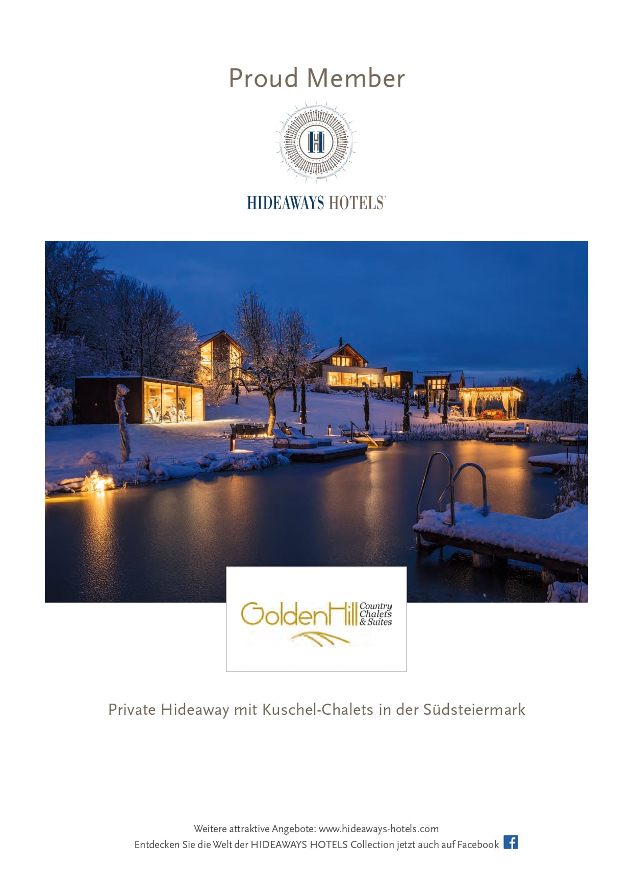 Golden Hill Country Chalets & Suites zu einem Traumurlaub in absoluter Privatsphäre ein. Das bereits vielfach prämierte Mitglied der Hideaways Hotels Collection wurde dieses Jahr unter anderem vom renommierten Gault&Millau Guide mit dem Award „Beste Chalets 2021“ ausgezeichnet.