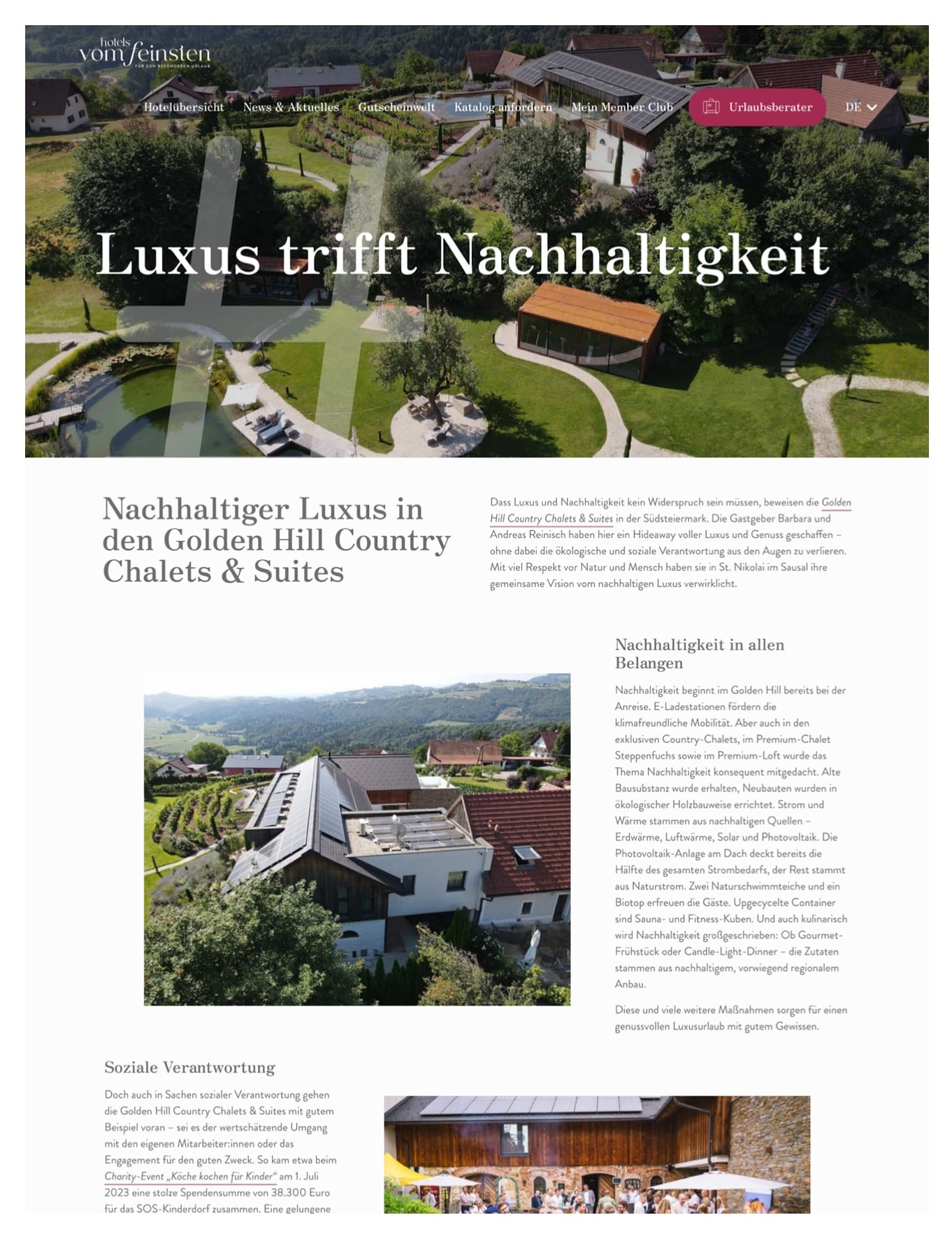 Die Golden Hill Country Chalets & Suites im südsteirischen Sausal sind ein ganz besonderer Ort zum Wohlfühlen. Abgesehen von der Tatsache, dass es sich um ein wunderschönes privates Hideaway mit besonders homogenen Baustil handelt, ist es auch ein Hotelkonzept, das auf Nachhaltigkeit, Ruhe, und Qualität setzt.