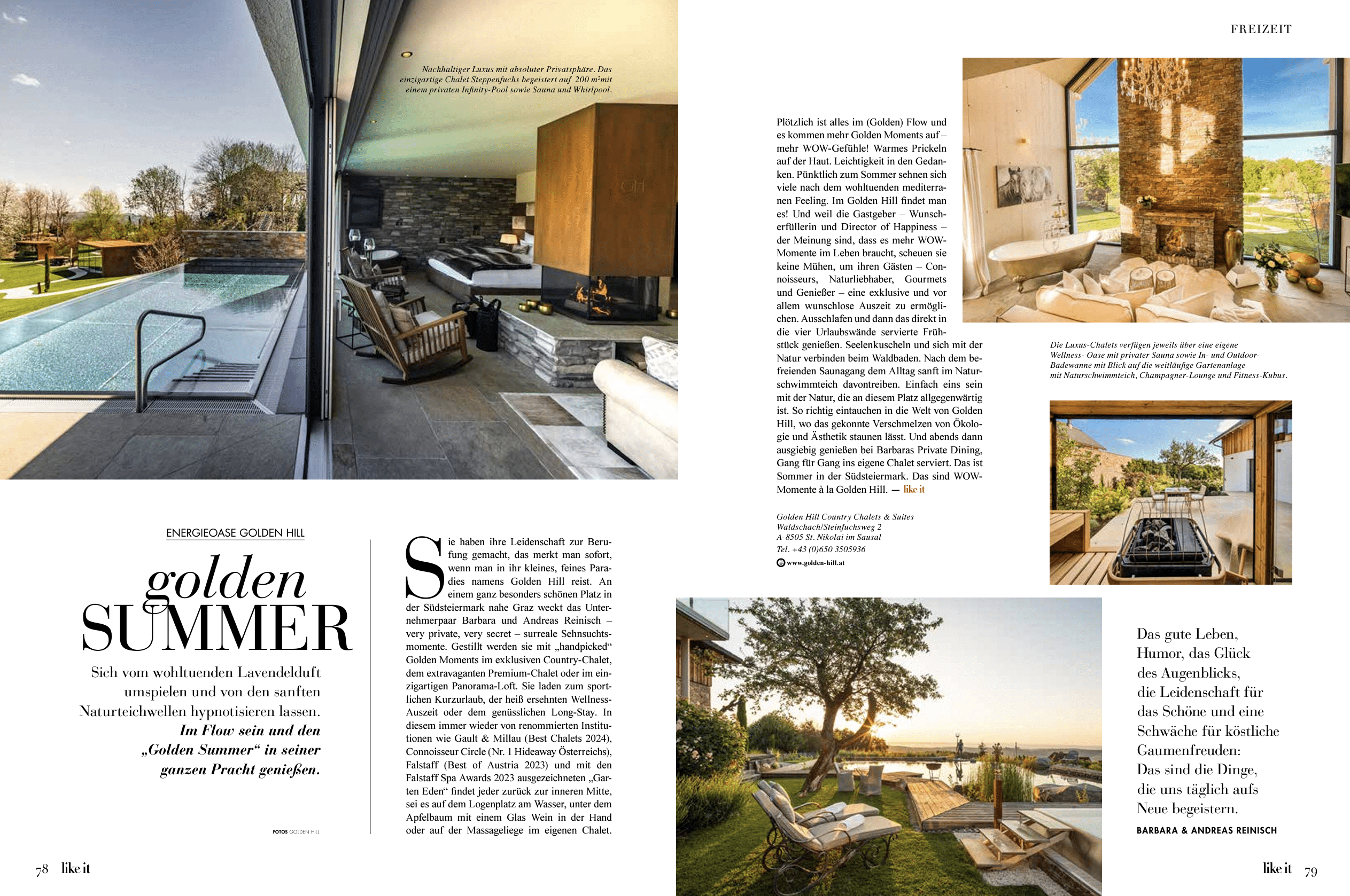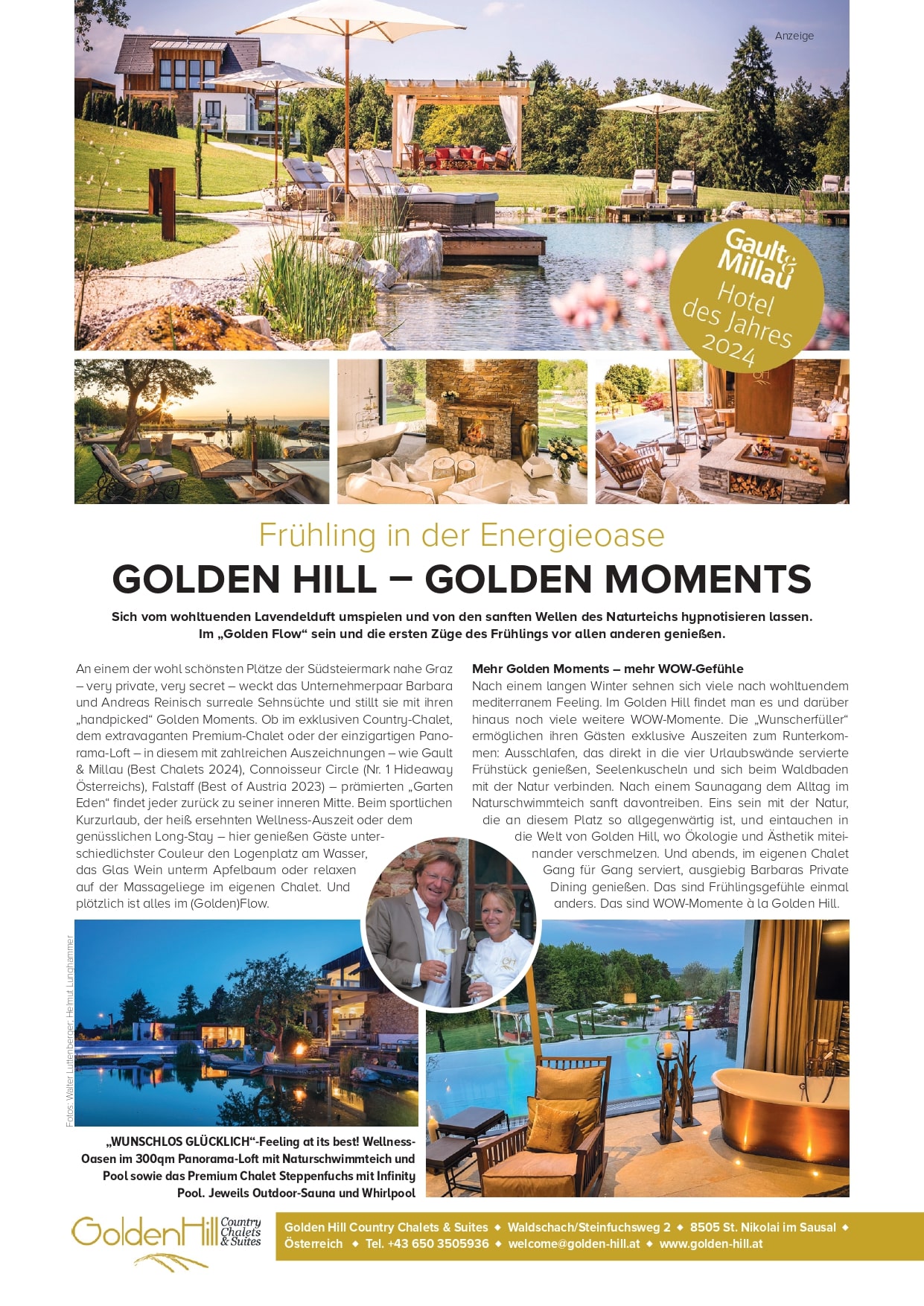 In der Südsteiermark schreiben Dr. Barbara und Andreas Reinisch mit ihren wunderschönen Golden Hill Country Chalets & Suites in St. Nikolai im Sausal seit nunmehr zehn Jahren eine Erfolgsgeschichte. Sie zelebrieren ihre Philosophie von „The Art of Hospitality“ an einem ganz besonderen Kraftort auf ihre eigene, bezaubernde Art und Weise.