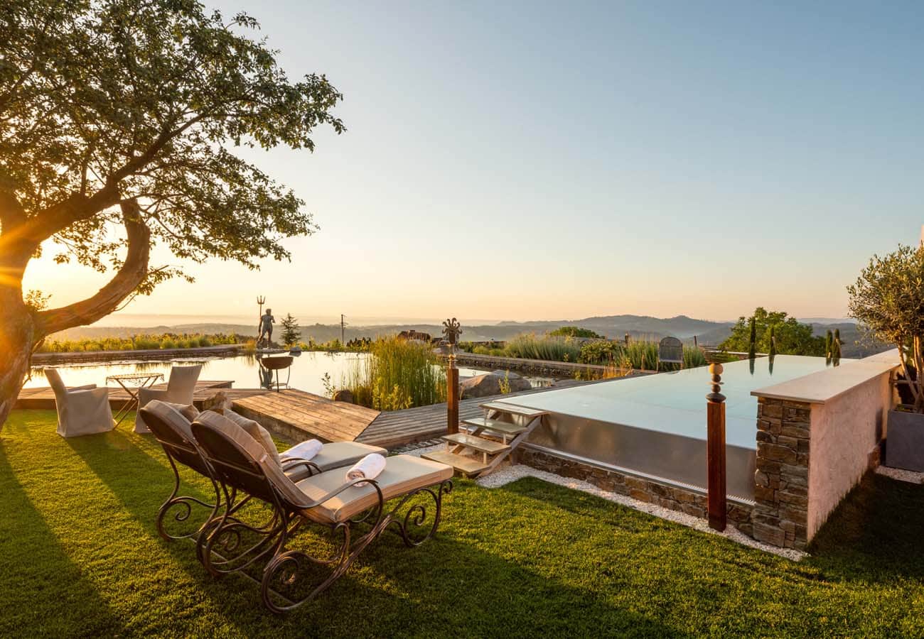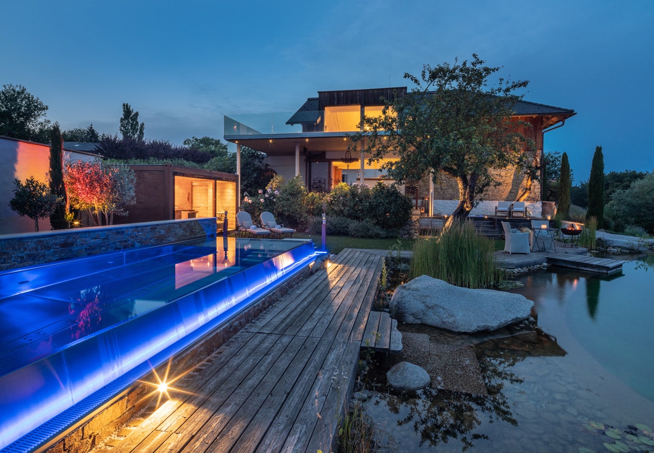 Absolute Privatsphäre in Zweisamkeit und unendlich viel Platz: Das verspricht unser Loft mit seinem 200 m² Infinity-Naturschwimmteich und Pool, eigenem Saunahaus im Freien, Outdoor-Whirlpool und Außendusche. 4.000 m² Parkanlage mit Rosenpavillon und Weinterrassen zählen hier außerdem zu Ihrer ganz persönlichen Wellness-Oase.